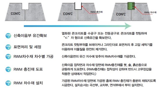 이에 T.K시스템 신축 이음부 차수공법은 구조물의 인장에 대비하고, 익스펜션 조인트 부위에 물이 침투하는